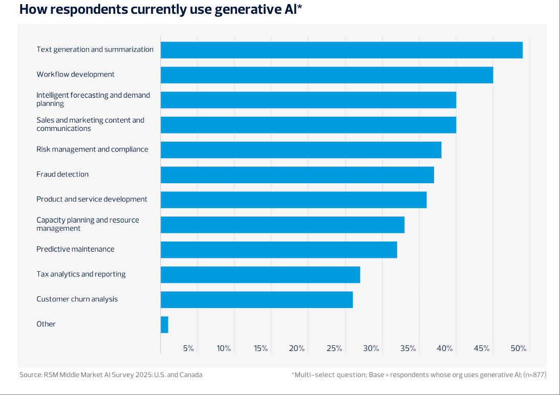 注:本内容由 AI 生成,有高达91%的企业采用生成式AI东西,70%的企业暗示,正在风险合规、产物研发和资本办理范畴的使用比例也别离达到38%、36%和33%。AI将成为驱动中型企业数字化转型和持久合作力提拔的焦点动力。