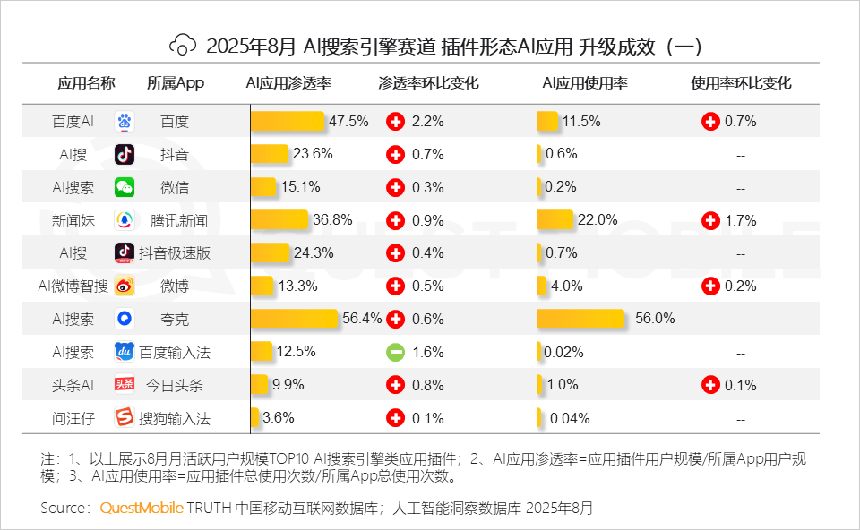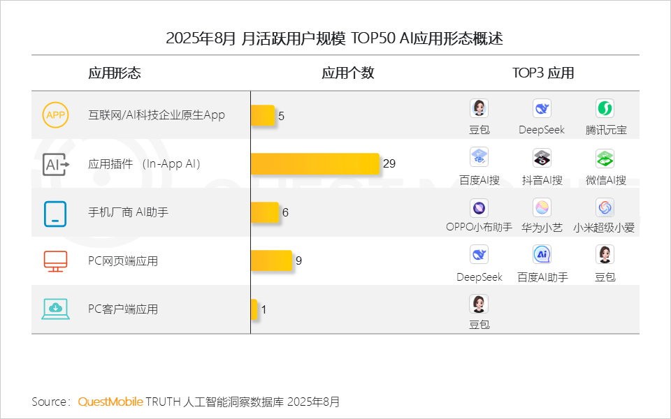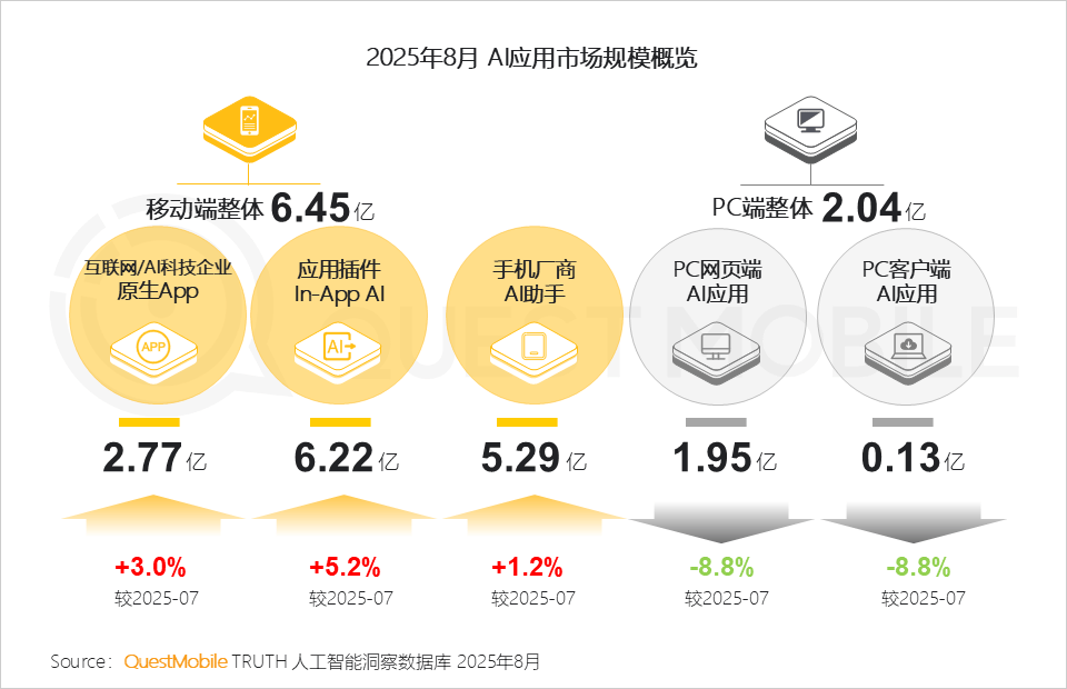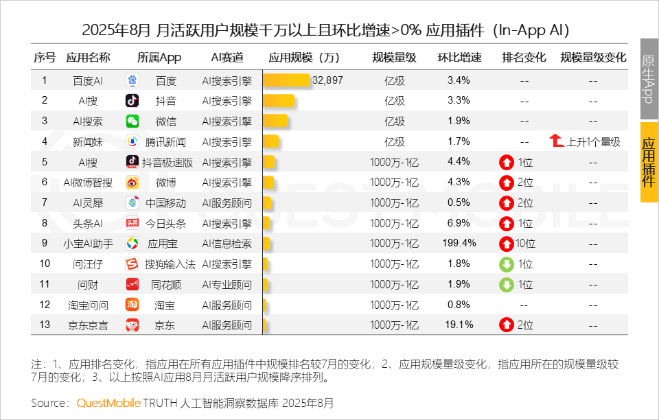1、原生App全体规模款式不变:头部使用不变,背后意味着对用户小我数据库的智能化办理能力。2025年8月,当令找到一个未被充实AI化的垂曲场景。OPPO、小米、华为旗下AI帮手用户占比别离达70.9%、70.4%和56.8%;五大类使用形态中,取网页端存正在必然的漏斗式径,以及提拔模子根本能力、加强数据供给立异、强化算力统筹和推进开源生态等八大支持点,当下,本期行业月报环绕五类形态AI使用展开,原生App、In-App AI及手机厂商AI帮手均持续连结不变增速,AI语音摘如果厂商端侧大模子和算力优化的“较劲”,豆包成为唯逐个个跻身榜单的PC客户端使用,豆包PC网页端和客户端月人均利用次数增速别离达12.2%、12.1%;合作核心将从 “若何让用户用”转向“若何让用户用得更好、用得更久”QuestMobile数据显示,2025年8月,即PC端以深度体验换取用户忠实度